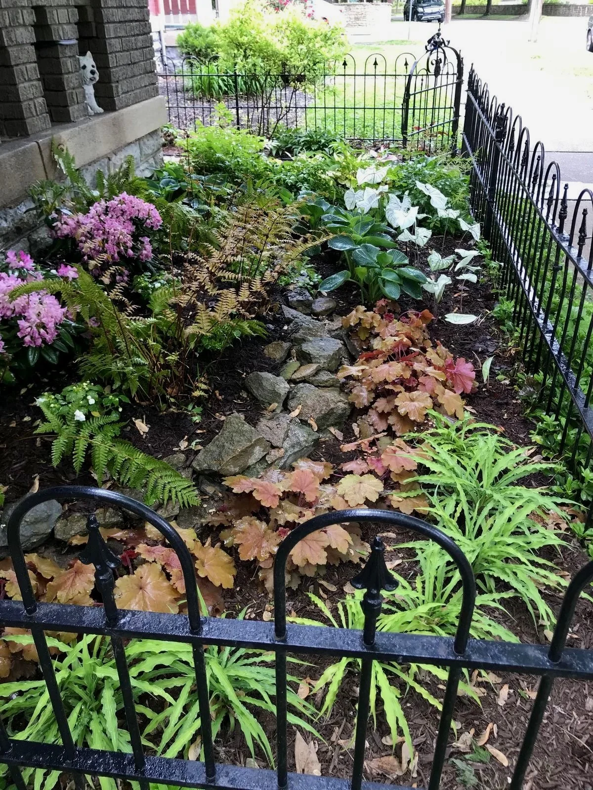 We are big fans of the West Highland White Terrier dog breed. When we were ready to get our second Westie, we adopted from the Westie Rescue group, rather than purchase another puppy. Thus Blanche became a part of our lives. We were working at the time and were not able to walk her during the day. Our friend and neighbor Dianne came to our rescue and walked Blanche every day at lunchtime. When Blanche crossed the rainbow bridge, we wanted to repay Dianne’s kindnesses for all those walks. I knew she wanted to step up the impact of her front garden, so I offered to redesign and plant the space. The space is particularly challenging as it sits in the shade of a maple tree, whose roots greedily suck up all the available moisture in the soil.