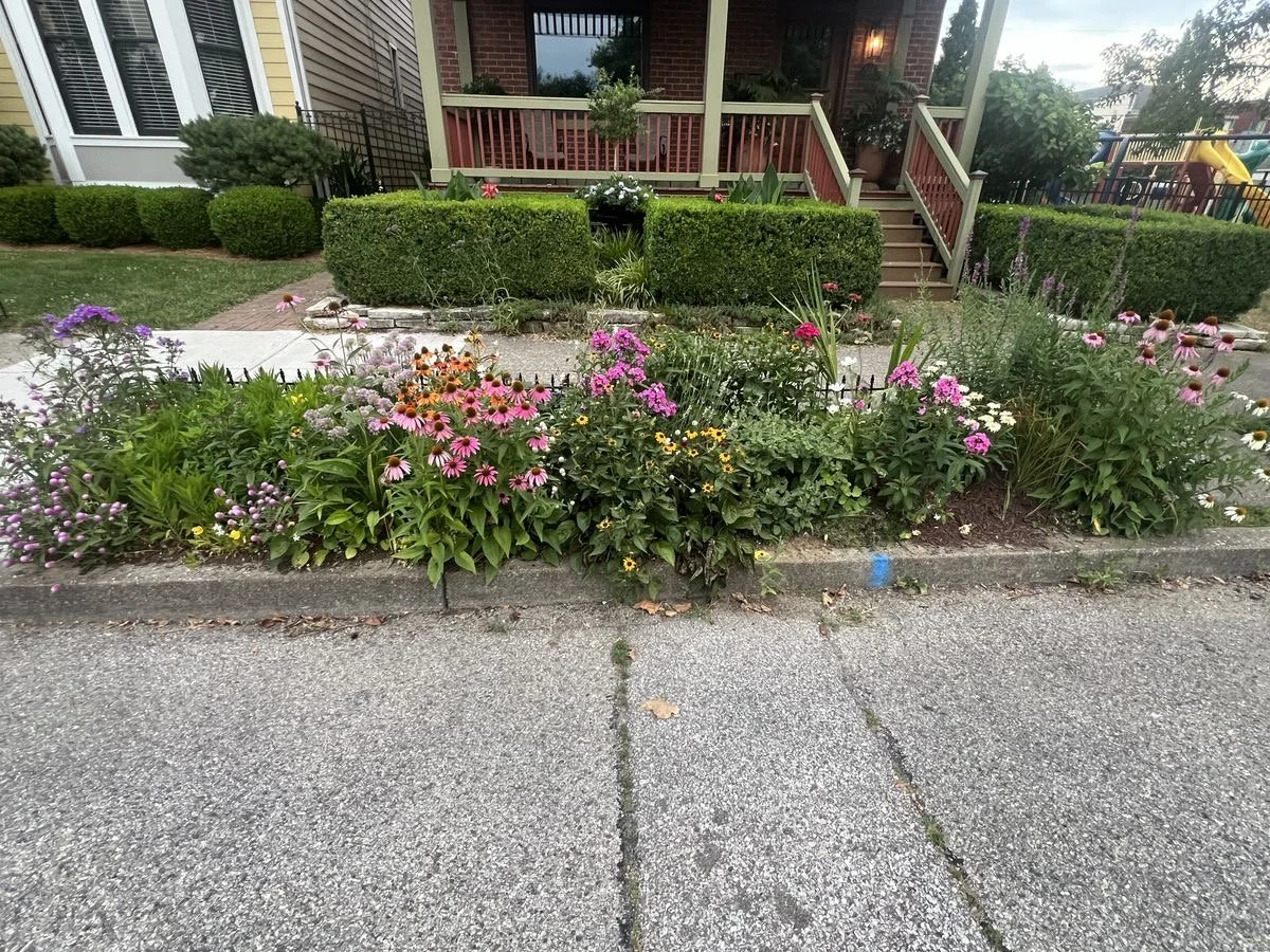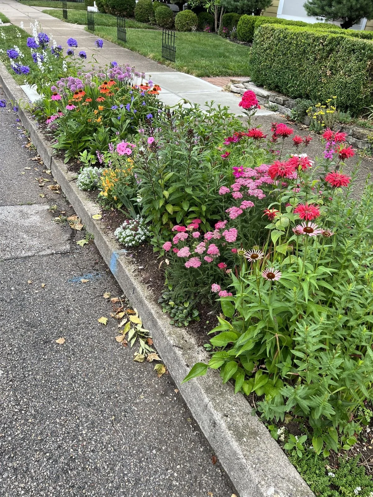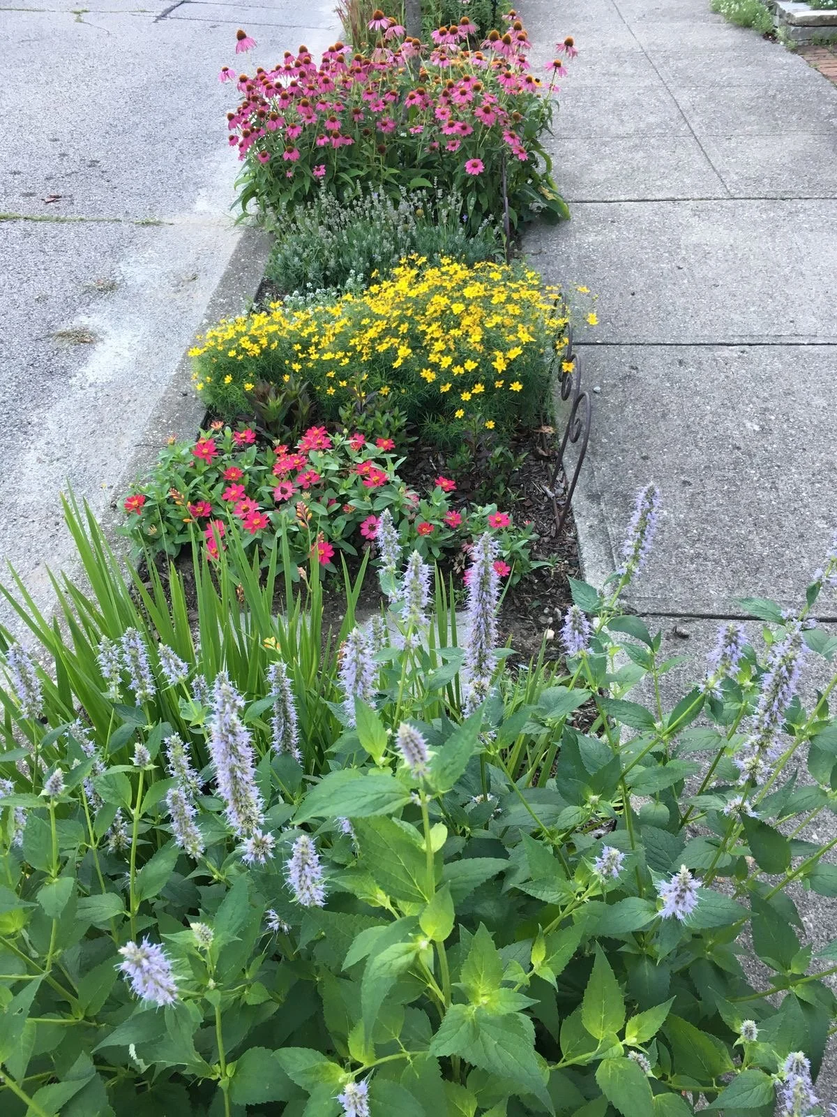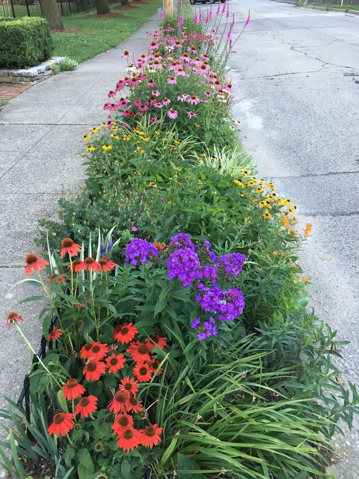 Whether you call them tree lawns, curb strips, or hellstrips, these gardens face really tough conditions. From the excessive heat generated by a blacktop street on one side and a concrete sidewalk on the other, to snow plows spraying salt, to dogs marking their territory, these gardens suffer many indignities. Flowers planted in these spaces must be tough. That doesn’t mean however you can’t make them a colorful space for passers-by to enjoy.
