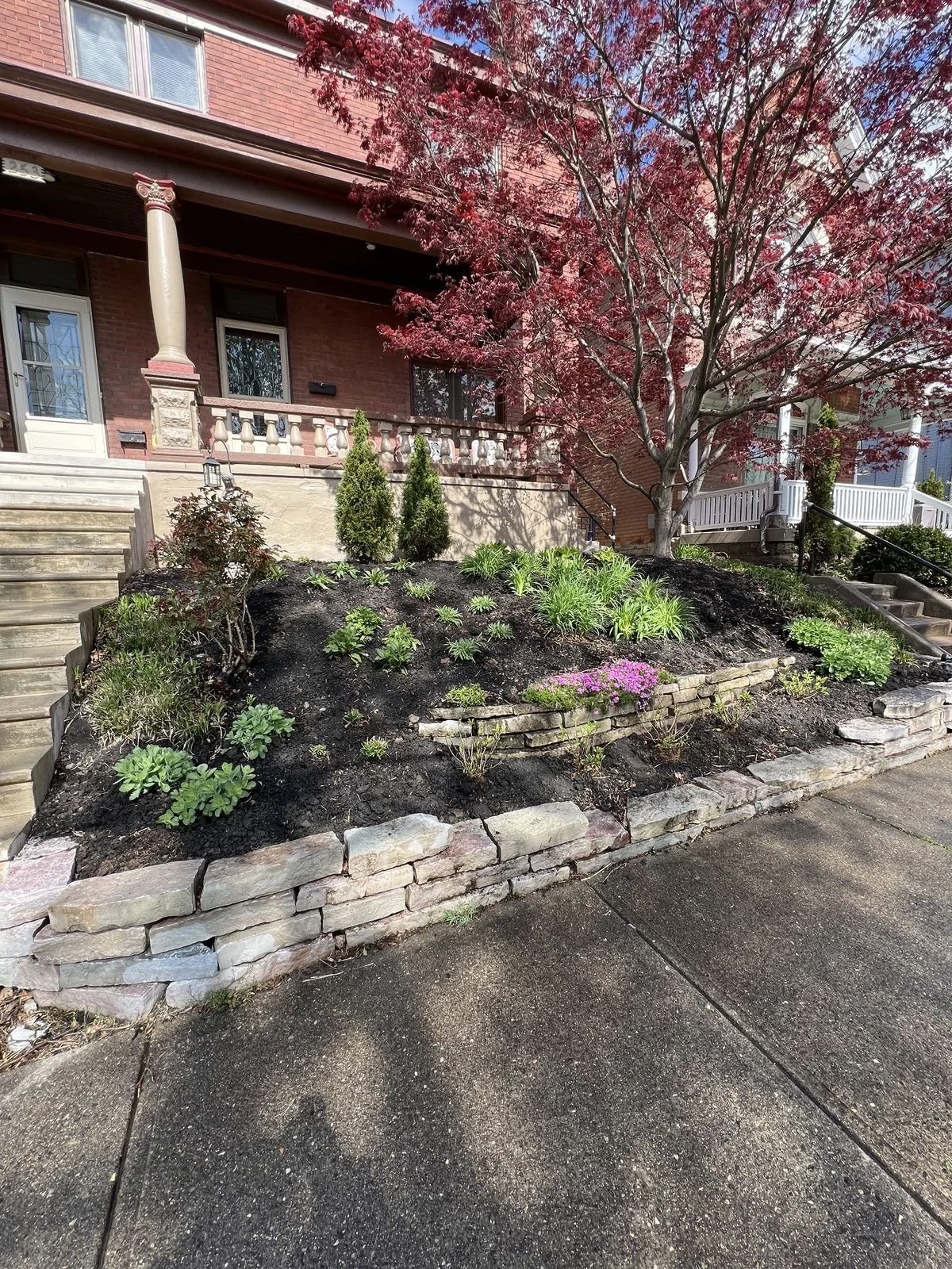 The owner of this property was unhappy with the performance of the existing flowers in her steep front garden, many of which had become shaded out as a Japanese Maple canopy spread over time. She shared that she likes to sit on her front porch and wanted a garden that was colorful all season, but that required little maintenance.