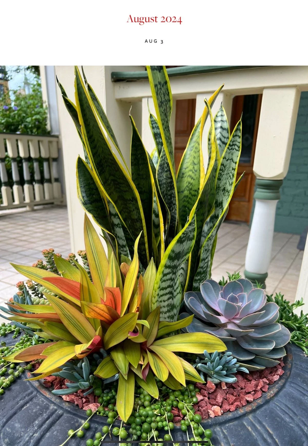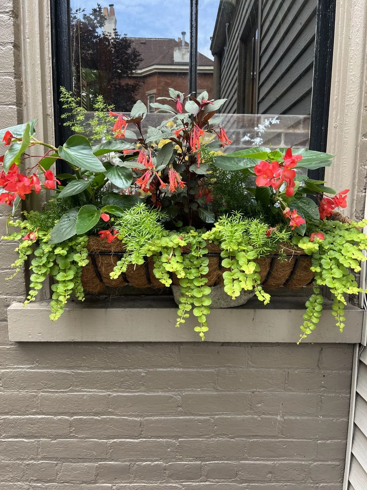 Summer is about abundance and color, so I like to design containers for the season which overflow and make a statement. I designed these three 6-foot long windowboxes for a friend who owns a small retail shop. She wanted something on the “hot” side of the color wheel, which would attract the attention of people driving along the major thoroughfare in front of her store. The 18 feet of red, yellow, and orange petunias, verbenas, million bells, and crotons was truly eye-catching.
