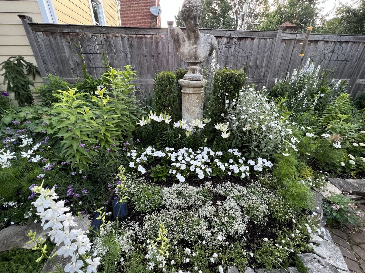 I understand gardens work best when they exhibit a unifying theme, especially when the space is small, like our little urban courtyard. I also know that decades of international travel and visiting gardens throughout Europe and Asia, have led me instead to a more eclectic design for our garden. This includes everything from a primarily white “Moon Garden” inspired by visits to Northern European gardens, to a cacti and succulents corner inspired by travels throughout the Mediterranean basin. The garden also includes Japanese Maples, bonsai, moss paths, and Buddha statues inspired by trips to Asia.